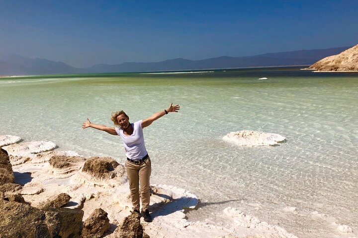 Stop: 85 minutes – Admission included. Arrive at the shores of Lake Assal. Spend time walking across the vast, sparkling white salt flats that surround the turquoise water. You can observe the salt being harvested by local Afar nomads and even take a quick “float” in the world’s most saline body of water (saltier than the Dead Sea).