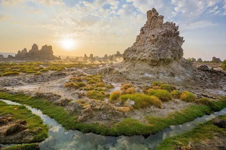 Wake before dawn for a spectacular sunrise walk among the chimneys to see colonies of pink flamingos on the lake shore. After breakfast, depart the camp and drive north toward the Rift Valley floor. Spend the afternoon at Lake Assal, the lowest point in Africa, walking on the brilliant white salt flats and floating in the turquoise waters. Conclude the tour with a visit to the Ghoubbet-el-Kharab (the Devil’s Abyss) to see Ardoukoba volcano before returning to Djibouti City by late evening.